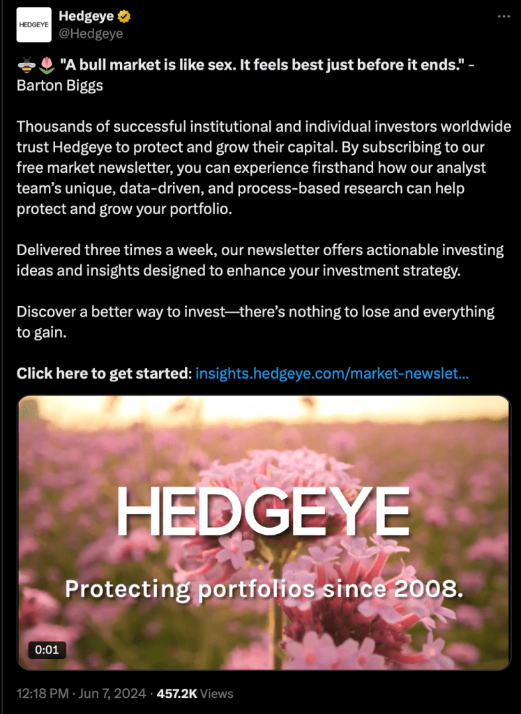 The purpose of these ads was to increase viral load by giving viewers valuable insight with a quote from one of the world’s smartest investors. The quote was supported by compelling video from nature to boost intrigue (causing viewers to pause upon scrolling to these Hedgeye posts).